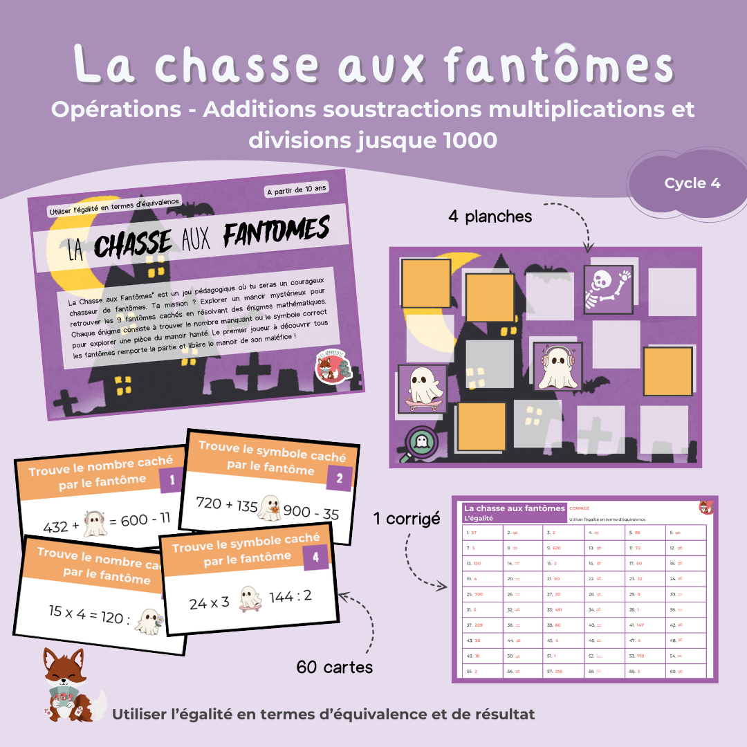 Chaque carte présente un calcul avec un nombre masqué par un fantôme. Le joueur doit trouver le nombre qui permettra d’établir une égalité correcte ou compléter la situation par le bon symbole. Il donne sa proposition oralement pour que son voisin de droite vérifie grâce au corrigé.